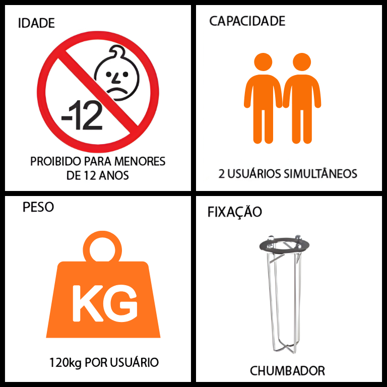 Projetado para atender ambientes profissionais e áreas públicas, suporta até 2 usuários com peso máximo recomendado de 120 kg por pessoa, sendo indicado para usuários acima de 12 anos. A fixação com flange reforçada e parafusos zincados assegura total estabilidade.